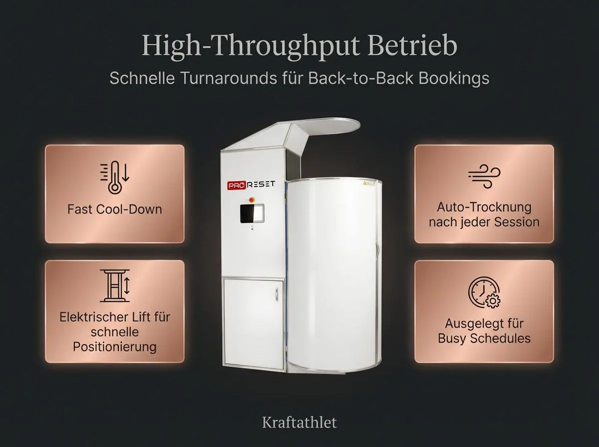 CryoPro Sauna ist auf schnelle Turnarounds gebaut: Fast Cool-Down, Auto-Trocknung und ein elektrischer Lift reduzieren Wechselzeiten. Ergebnis: mehr Slots pro Tag, weniger Leerlauf.