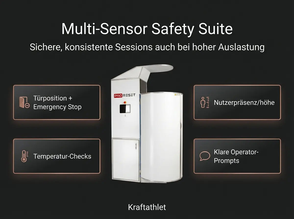 Die Multi-Sensor Safety Suite ueberwacht u.a. Tuerposition, Nutzerpraesenz/hoehe, Temperatur und Emergency-Stop Inputs. Klare Operator-Prompts helfen, Sessions auch bei hoher Auslastung konsistent zu halten.