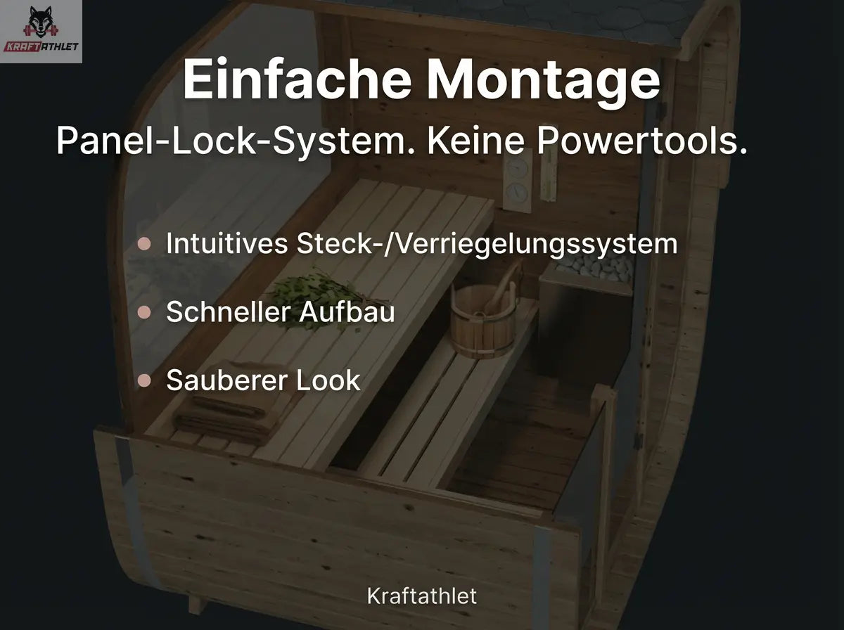 Die Sauna nutzt ein Panel-Lock-System. Die Montage ist auf einfache Installation ausgelegt und benötigt keine Powertools.