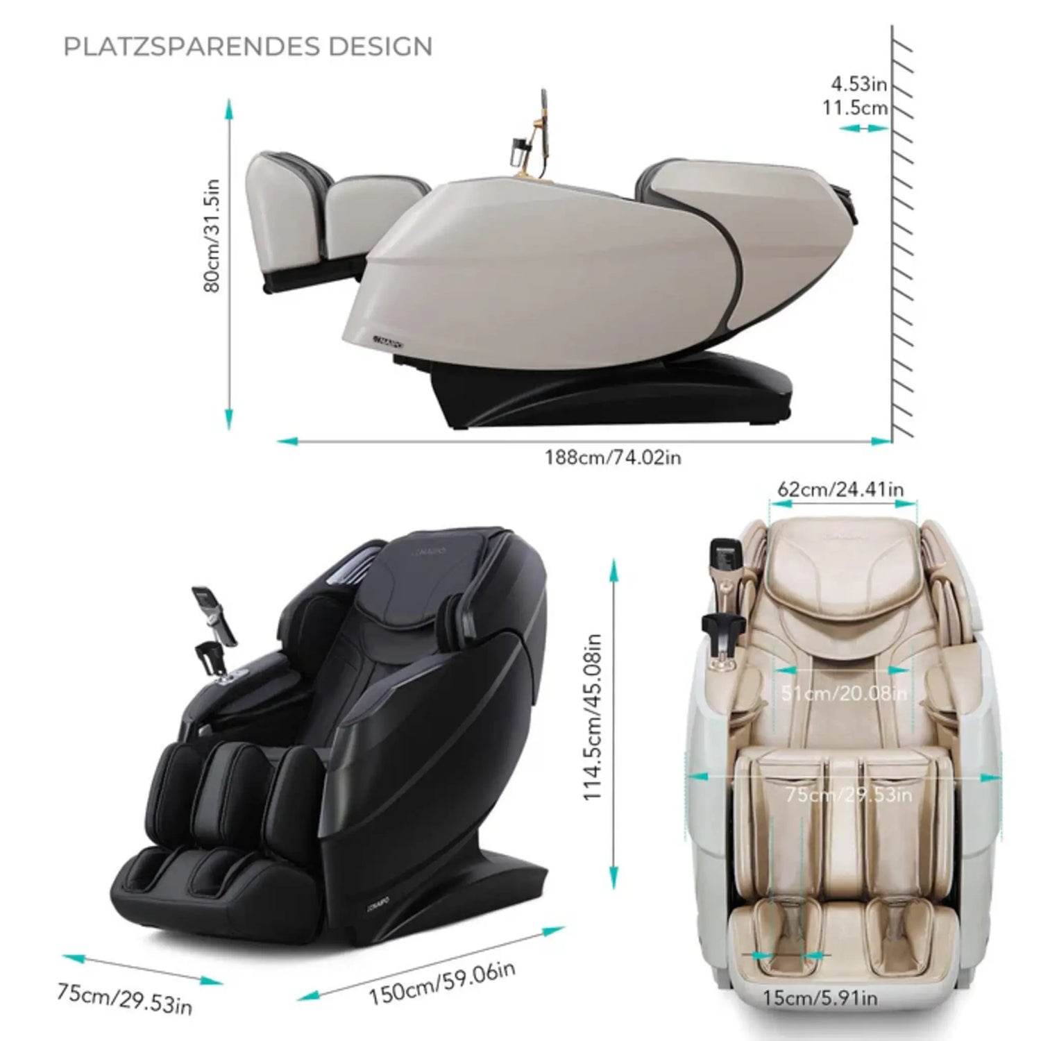 In aufrechter Position: 157 × 82 × 126 cm. In Liegeposition: 186 × 82 × 88 cm. Dank der Sliding-Base-Technologie benötigt der R50 nur minimal Wandabstand – die Basis gleitet nach vorne, während sich der Stuhl nach hinten neigt.