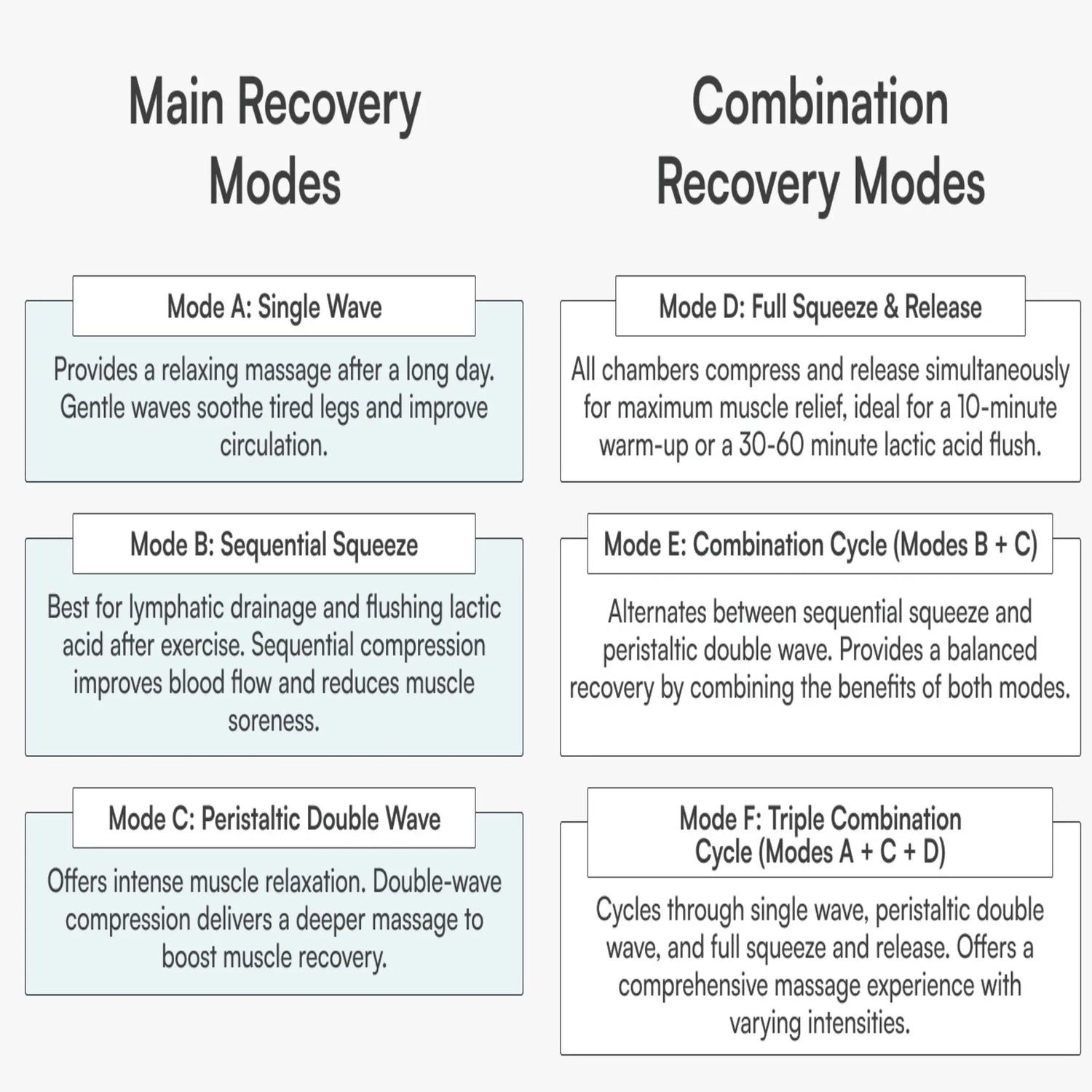 Das Aerify Standard System bietet sechs speziell entwickelte Recovery-Programme, die verschiedene Therapieansätze und Intensitätsstufen abdecken. Diese Programme wurden in Zusammenarbeit mit Sportwissenschaftlern und Physiotherapeuten entwickelt, um optimale Ergebnisse für unterschiedliche Anwendungsszenarien zu gewährleisten.