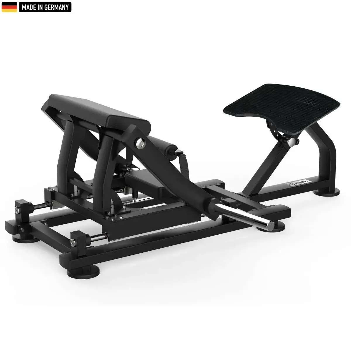 Bietet den Benutzern Ihres Fitnessstudios die Möglichkeit, Hip Thrust-Übungen oder Hüftstöße ohne die Verwendung von Bänken, Stangen oder zusätzlicher Ausrüstung durchzuführen. Dieses Gerät bietet Stabilität und Sicherheit durch das obere Rückenpolster, das die Wirbelsäule stützt. Die Maschine ermöglicht es, sowohl in der Länge als auch im Winkel der Fußplatte vollständig einstellbar zu sein, sodass die perfekte Hip Thrust-Einstellung erstellt werden kann. Ein gepolsterter Gürtel mit automatischer Verriegelungsfunktion sorgt für zusätzlichen Komfort und Sicherheit.